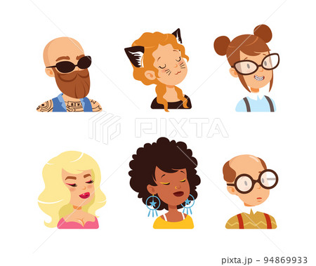 Collection of portraits of people. Male, female persons and children with different skin color, hairstyles and accessories vector illustration