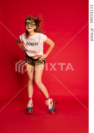 Dynamic portrait of fashionable stylish young girl in t-shirt and shorts rollerblading over red background. Youth, fashion, happy emotions and active lifestyle concept