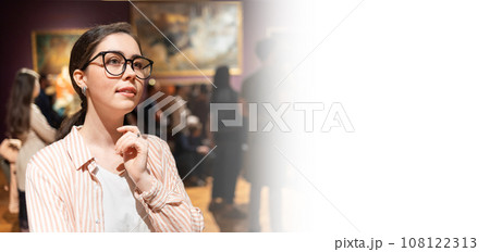 Web banner of cultural education. Portrait of young Caucasian woman wearing glasses and looking at exhibition. Masterpieces in background. Mock up with copy space. Concept of Museum Day
