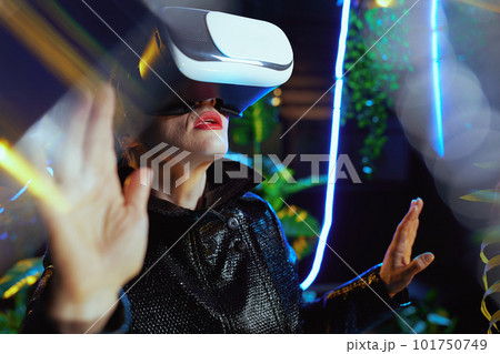 a gray-haired middle-aged woman with a bob haircut is dressed in a jacket and trousers enjoying