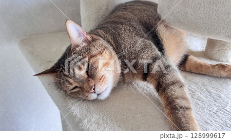 キャットタワーでくつろぐキジトラ猫とサバトラ猫