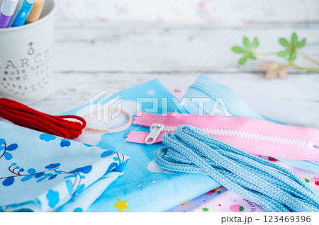 裁縫道具とアクリル紐やファスナー・クリップ