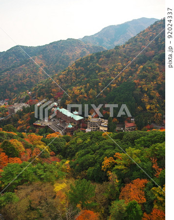御在所岳ロープウェイから紅葉に包まれた湯の山温泉を望む