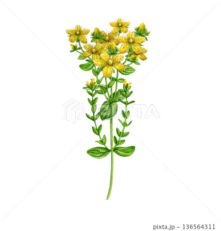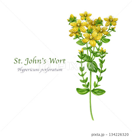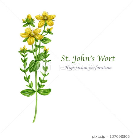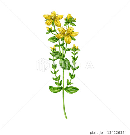 St. John's wort herb watercolor illustration. Hand drawn hypericum perforatum medicinal plant vintage style realistic illustration on white background. St Johns wort herbal treatment ingredien