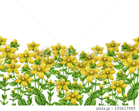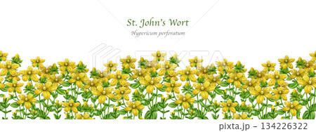 St. John's wort herb seamless border watercolor illustration. Hand drawn hypericum perforatum medicinal plant vintage style illustration. St Johns wort border decor element on white background