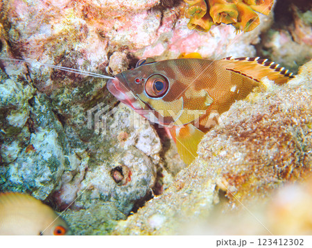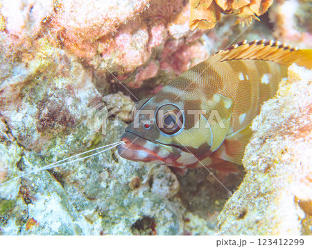 大きく美しいアカハタ(ハタ科)。 口から捕食したオトヒメエビの触角が飛び出している。ヒリゾ浜