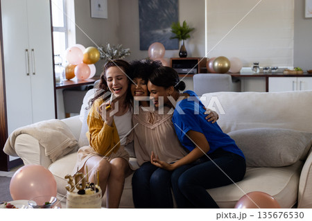 Women celebrating at home, enjoying cake and snacks with festive decorations