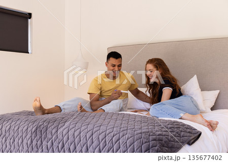 Young couple sitting on bed, joyfully looking at pregnancy test together