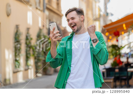 Happy man using mobile smartphone celebrating win good message news, lottery casino jackpot victory