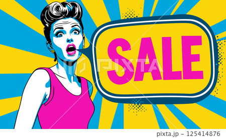 Sale. Bright poster in pop art retro comic style. Young beautiful woman in great amazement and speech bubble with word sale