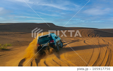 Desert safari on off-road vehicles. Sandy clubs, red-yellow sand.