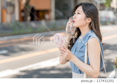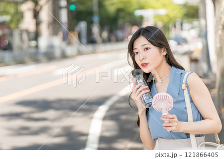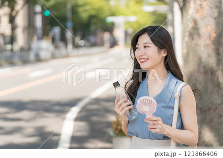 ハンディファンとペットボトルの水を持って木陰で涼むビジネスウーマン