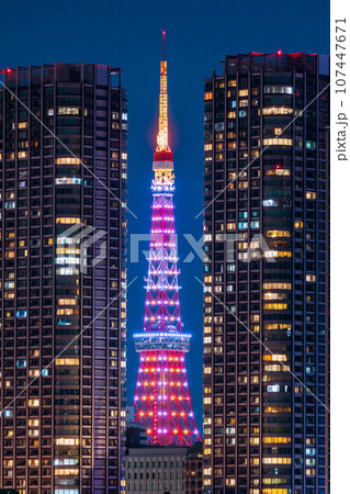 夜景「東京都」ビルの隙間から見える東京タワーライトアップ