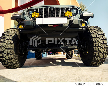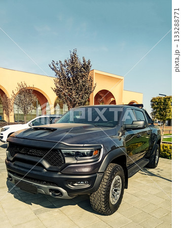 a powerful modern off-road pickup truck at an exhibition on a sunny day