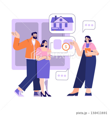 Vector illustration of a couple consulting a realtor about buying a house. The realtor discusses home buying options, presenting financial details. The couple listens attentively, exhibiting interest.