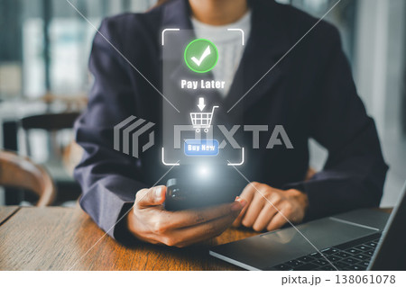 Businesswoman using smartphone for online shopping with pay later option in a modern office setting.
