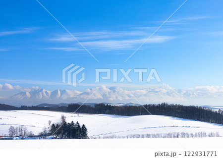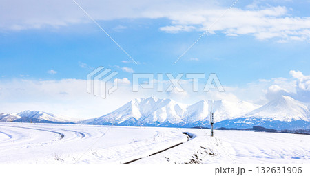 冬の北海道美瑛町の丘から見た冠雪した十勝岳連峰の風景