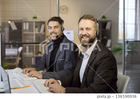Smiling call center operators at desktops providing customer service support