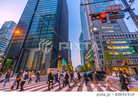 日本の東京都市景観 コロナ禍の大手町駅前交差点からオフィスビル群などを望む・奥は神田方向=4月12日