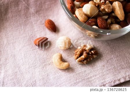 食塩無添加のミックスナッツ【木目背景】
