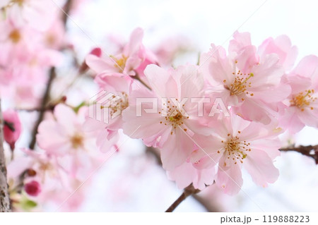 淡いピンクの思川桜のクローズアップ 【背景ボケ】 【背景ぼかし】