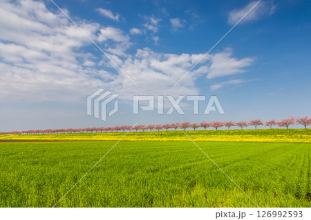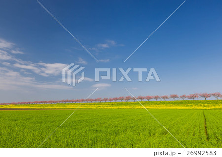 栃木県小山市 思川沿いの間々田地区と乙女地区にまたがる思川桜堤 麦畑の先の桜並木と菜の花畑