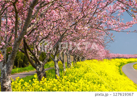 栃木県小山市塩沢 思川沿いに続く思川桜堤 原産種の思川桜並木と斜面の菜の花畑