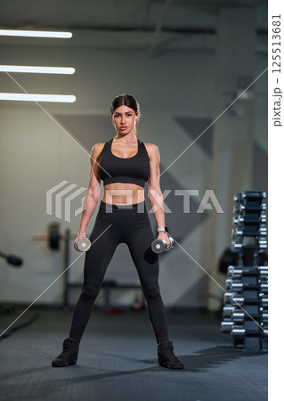 dedicated woman stands confidently in fitness facility dressed in athletic apparel. She poses dumbbell emphasizing strength and determination during workout session.