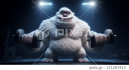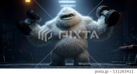 A Cute Giant and Obese Yeti Lifting Two Dumbbells to Lose Weight in a Dark Gym - Generative Ai