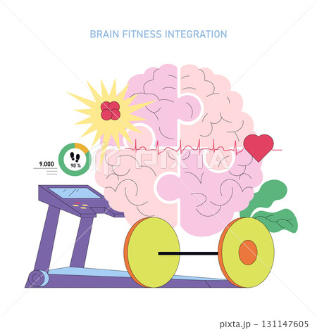 Vector illustration depicting brain fitness integration with elements like a brain, treadmill, heart rate, and weights. Highlights the connection between physical and mental wellness.