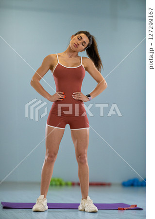 girl athlete stands in a gym tilting her head to the right and left. She wears a fitted outfit and appears focused while engaging in a warm up routine.