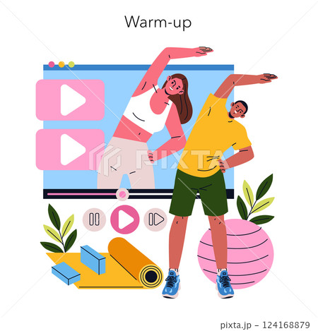 Remote personal training offers a dynamic way to engage in fitness. This illustration showcases participants doing warm-up exercises guided by an online video, emphasizing flexibility and motivation.
