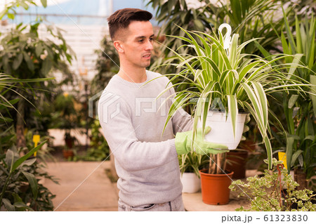 Woman gardener is standing with flowers Nephrolepis in orangery