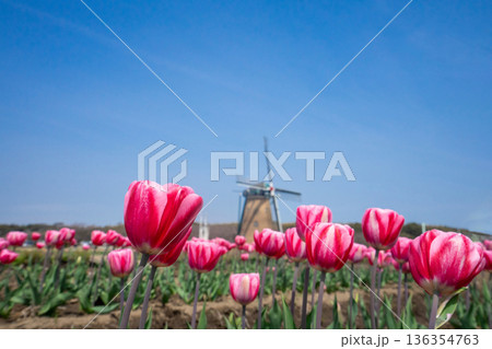 風車とピンクのチューリップ畑