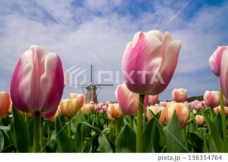 風車とピンクのチューリップ 千葉県佐倉ふるさと広場の春の花畑 青空の風景