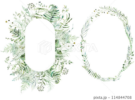Oval frames with Watercolor fragile stems and tiny green leaves isolated illustration, botanical wedding