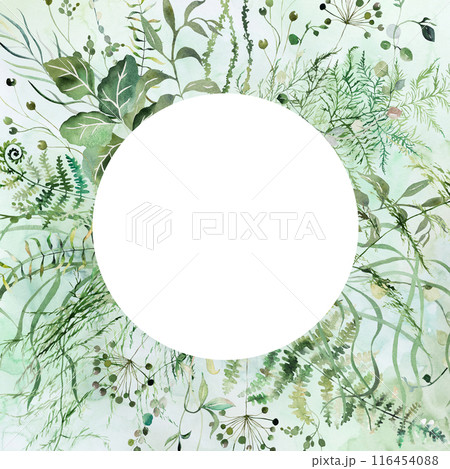 Round frame with Watercolor fern twigs with green leaves isolated illustration, botanical wedding