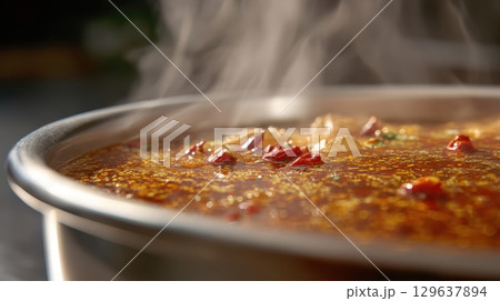 Close-up of boiling Malatang pot with chili oil, spices and steam for authentic Asian culinary photography