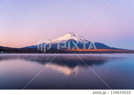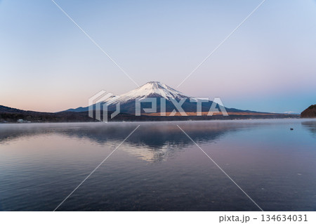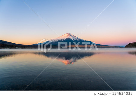 冬の山中湖の湖面に映る紅富士