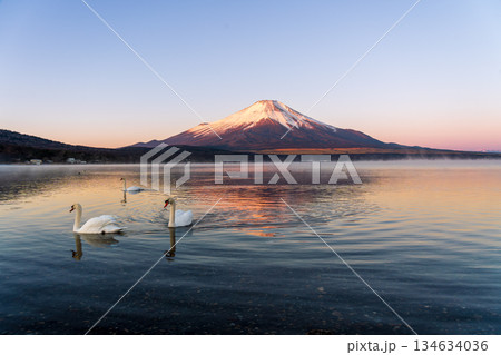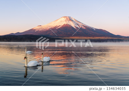 冬の山中湖の湖面に映る紅富士と白鳥