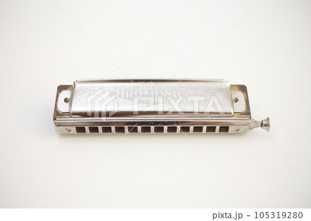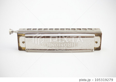 白い背景で撮影した古いハーモニカ