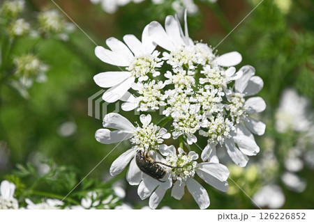 春の花壇に咲くオルレアホワイトレースの白い花に止まるヒメトラハナムグリ