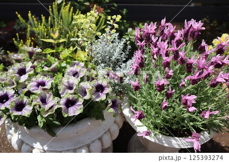 ペチュニアとフレンチラベンダーの寄せ鉢