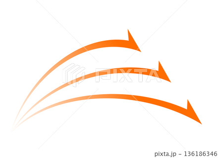 左下から前進するオレンジの曲線矢印イラスト|方向・流れ・成長・戦略を表すシンプル素材