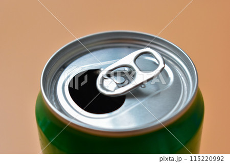 aluminum green drink cans on orange background, open cold fresh beverage