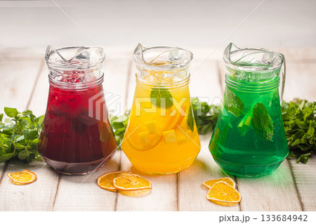 Colorful fruit lemonades in pitchers