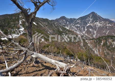 オロ山付近から見た残雪の皇海山と鋸山、渡良瀬川源流域