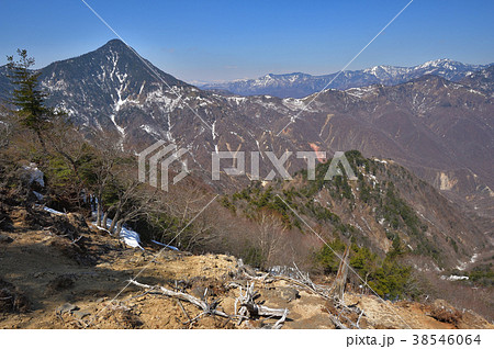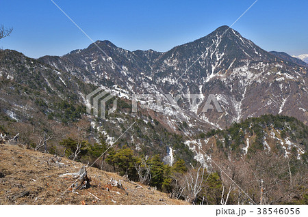 庚申山付近から見た残雪の皇海山と鋸山、渡良瀬川源流域
