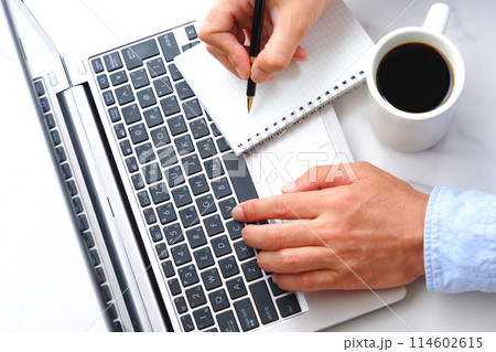 机にノートパソコンやノートを広げ、コーヒーを飲みながらデスクワークをしている男性の両手のイメージ