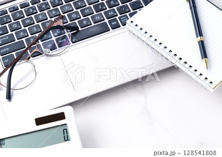 電卓とノートパソコンでデスクワークをしているイメージ